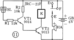 继电器电路 见图9 。继电器K选用JRC—21F等超小型弱功率电磁继电器,线圈电压选6V,消耗功率0.36W。由于继电器线圈工作电流60mA,比玩具电动机工作电流小,比蜂鸣器、发光二极管工作电流大,因此设计电路时各元件参数介于两者之间,图中参数供参考。在图9继电器电路中,F为衔铁,D为常闭触点,E为常开触点。当控制开关S闭合时,继电器吸合,常开触点F-E接通,发光二极管VD1点亮,R2为限流电阻器。图9控制开关S换成干簧管开关、双金属复片开关,就可以进行磁控和热控自动控制了。继电器触点可以根据需要选用常开或常闭触点。由于继电器触点与传感控制电路隔离,选用JRX型继电器,其触点可以接220V交流电,直接驱动交流电用电器。这些简单的自动控制器有什么用途呢?比如,利用荧(日)光灯中启辉器中的双金属复片,改制成可控温度传感器,制作成简易电子恒温箱、酸奶器,甚至炕头孵化鸡蛋的过热、过冷报警器等。 继电器自动控制电路 如图10~12所示。其中,图10为继电器光控电路,图11为继电器湿度控制电路,图12为继电器压力控制电路。在图12中,BZ为压电陶瓷片,此时做为压力传感器,敲击时能够产生正、负尖顶脉冲电信号,加到控制电路输入端,二极管VD1为负尖顶脉冲电流提供通路。电阻器R1和电容器C1组成充放电电路,以增加正向脉冲宽度,延长继电器吸合的时间。实验时,对压电陶瓷片突然施加或减少压力时,继电器都会吸合、发光二极管点亮一次。如果将图12改装成声控电路,还需要把压电陶瓷片声音传感器产生微弱的电信号进行放大,才能够驱动继电器电路工作。
